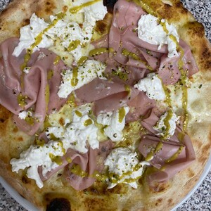 pomodoro e crema al tartufo, mozzarella e funghi porcini. Fuori dal forno: prosciutto crudo e burrata